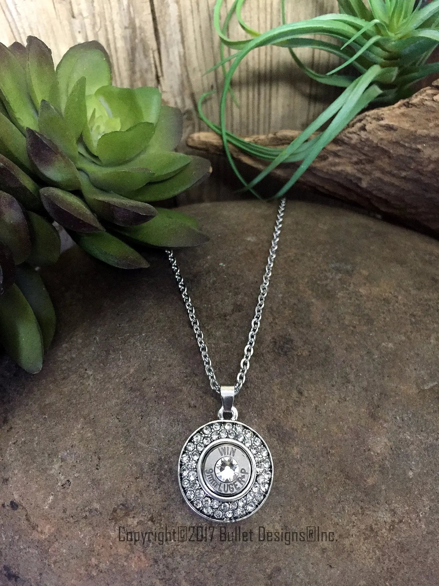 Dazzle your friends and family with our Fire & Ice Long Bullet Necklace! It comes with a recycled 9mm bullet head in your choice of nickel or brass and the Swarovski crystal color of your choice on the bullet (the outer crystals will be clear), a 34" stainless steel chain, and an antiqued silver plated pendant base. The pendant is just over 3/4" in diameter.
