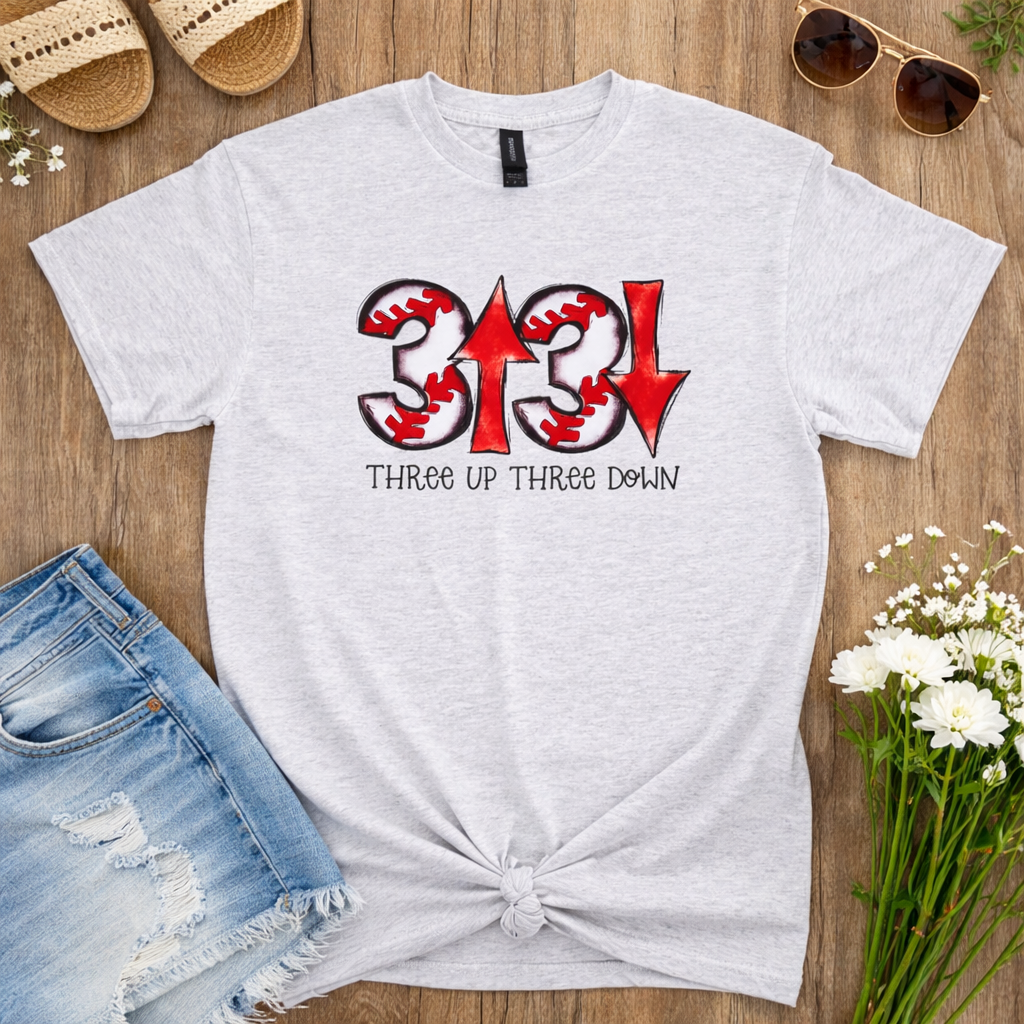 Step up to the plate in this classic ash gray graphic tee featuring a vintage ball field design. Perfect for baseball enthusiasts and casual sports fans, the "Three Up Three Down" tee combines comfort with timeless athletic style. Made for everyday wear, this shirt celebrates America's favorite pastime with understated charm. Whether you're heading to the game or just showing your love for baseball, this versatile piece pairs effortlessly with jeans or shorts for a relaxed, put-together look.